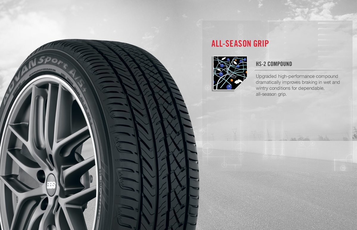 The ADVAN Sport A/S+, an all-season tire specifically engineered to deliver ultra-high performance at every turn. Featuring our new HS-2 Compound, this tire offers a serious upgrade in braking and effortless handling in wet and cold conditions.