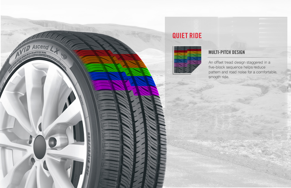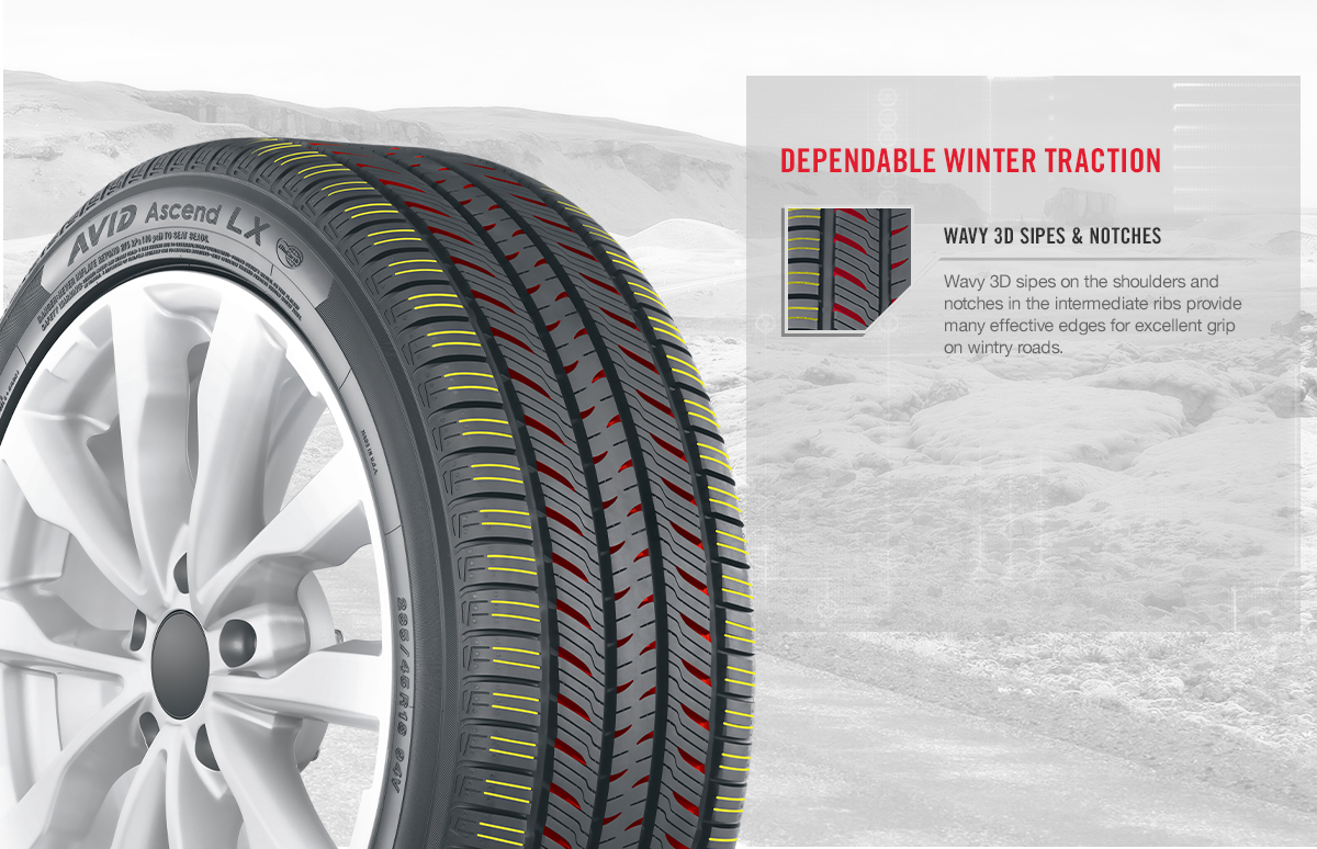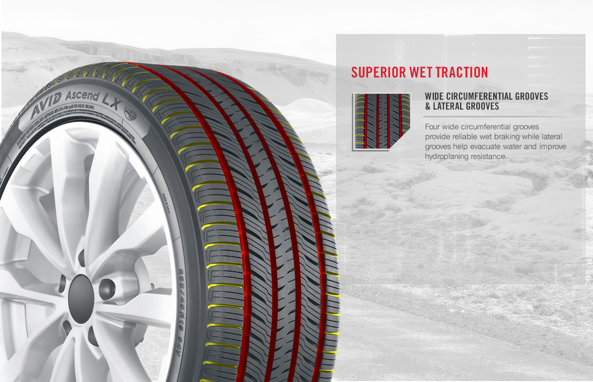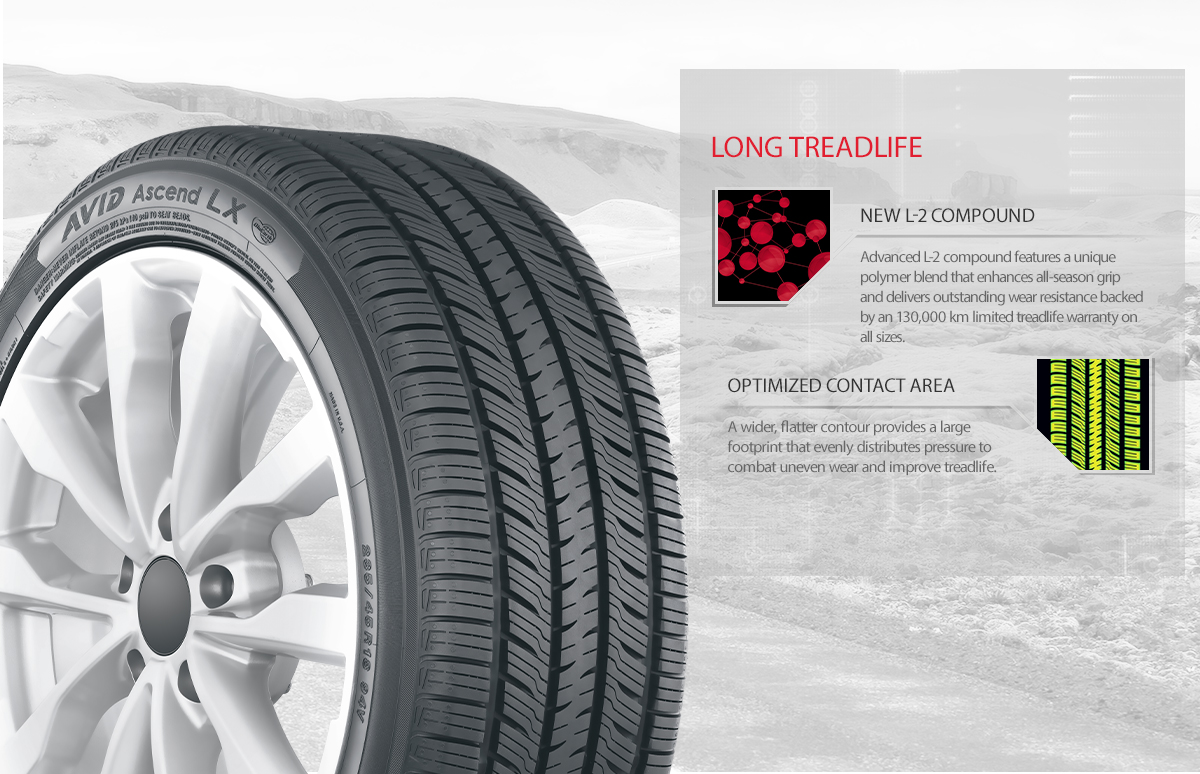 The AVID Ascend LX is exactly what your touring tire customers are looking for. With exceptional all-season traction backed by an impressive 130,000 kilometers Limited Treadwear Warranty, the AVID Ascend LX is without a doubt the most complete touring tire available today.