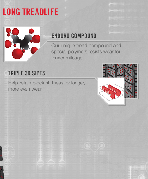 Enduro Compound helps rubber remain pliable over a broad range of temperatures for enhanced braking and handling in wet and snow.