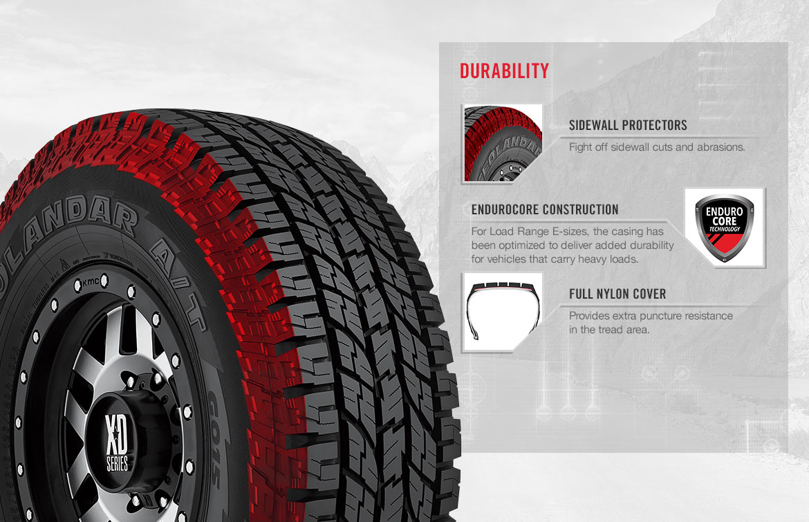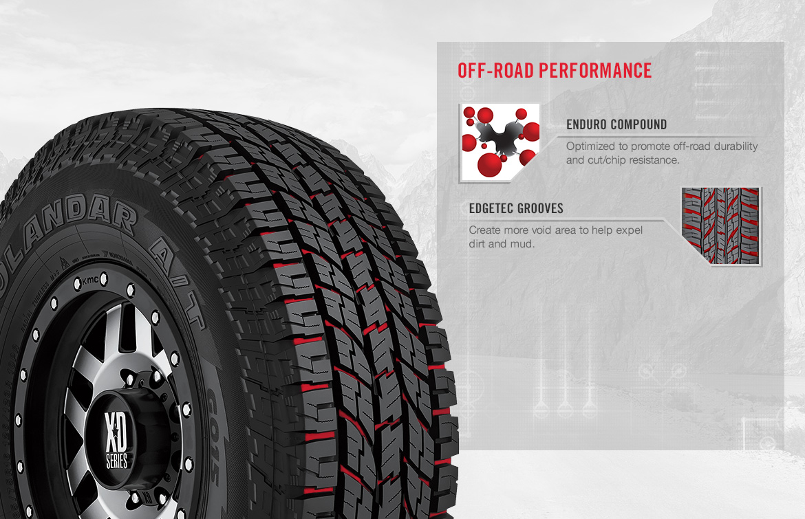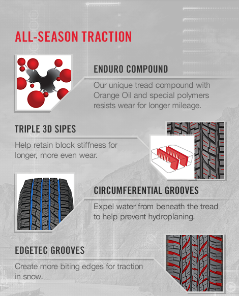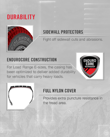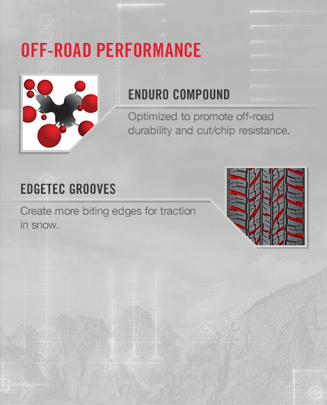 This all-terrain tire is designed with traction and grip in mind. Its outstanding off-road and on-road handling, combined with its longer mileage capability makes this tire a true performer.