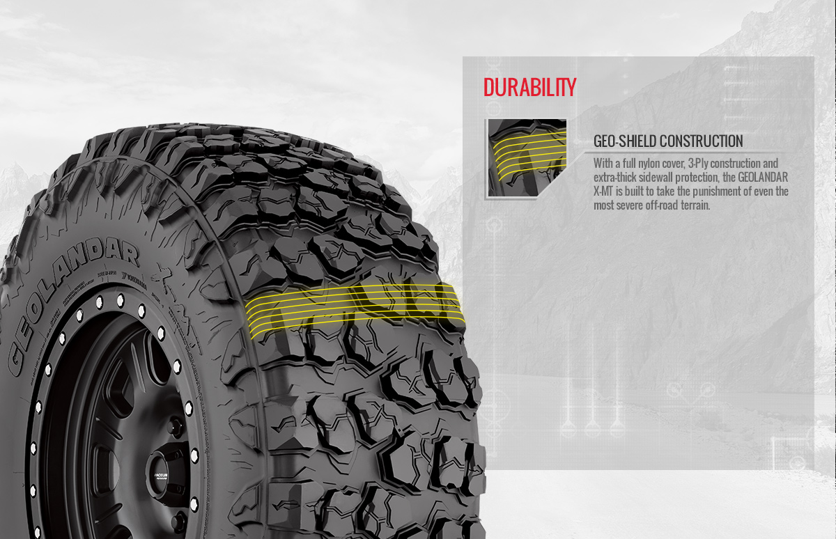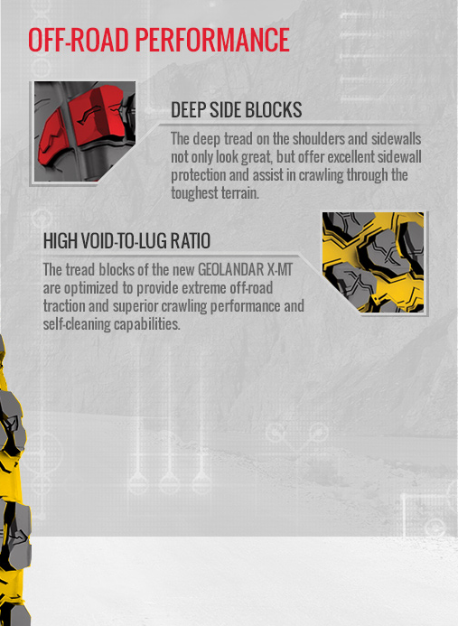 Engineered for today's hardcore rock-crawlers, the GEOLANDAR X-MT demands respect on any trail.
