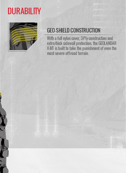 Constructed with GEO-SHIELD technology, the GEOLANDAR X-MT delivers relentless off-road grip, ruthless performance and the strength to get you to the top — and keep you there.